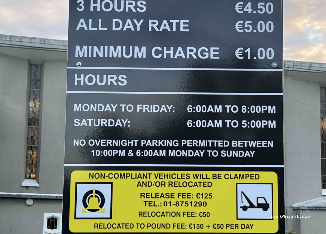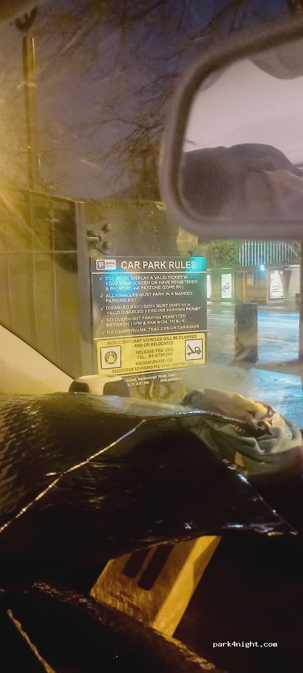 Private parking with gates always open, chargeable for the whole day from 7:00 to 19:00, possibility of free overnight parking. 50 meters from the DART surface tram which takes you to the center in 15 minutes. Some road noise. Edit: NEW SIGNAGE SAYS NO OVERNIGHT STAY