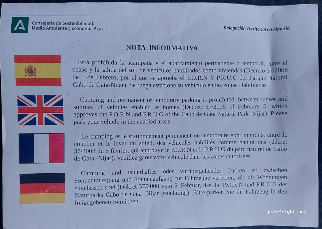 Genauso wie am Playa de los Genoveses wurden hier gestern Abend und heute Abend alle stehende Fahrzeuge und Wohnwagen von der Polizei gebeten den Platz zu räumen. Übernachten verboten!!!