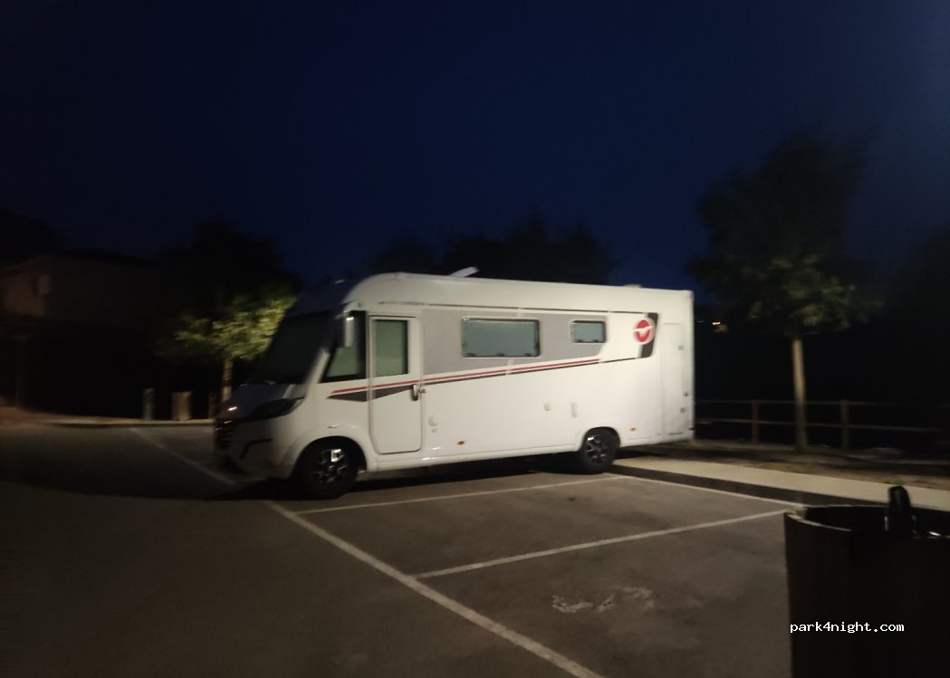 It is a public parking provided by the municipal for dog walkers mainly close to a busy road. Parking spaces are small and short. With my 6.4x2.3 van I didn't fit at all. There is movement all evening until 11pm by car and on foot too. There is a sensitive dog in the neibourghood who is barking randomly. I spend a night there but I do recomend only as an emergency stopover.
