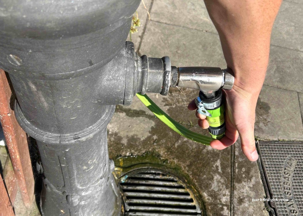 Trinkwasser auf einem Spielplatz. Benötigt eine anpassbare Düse, kein Gardena-Anschluss.