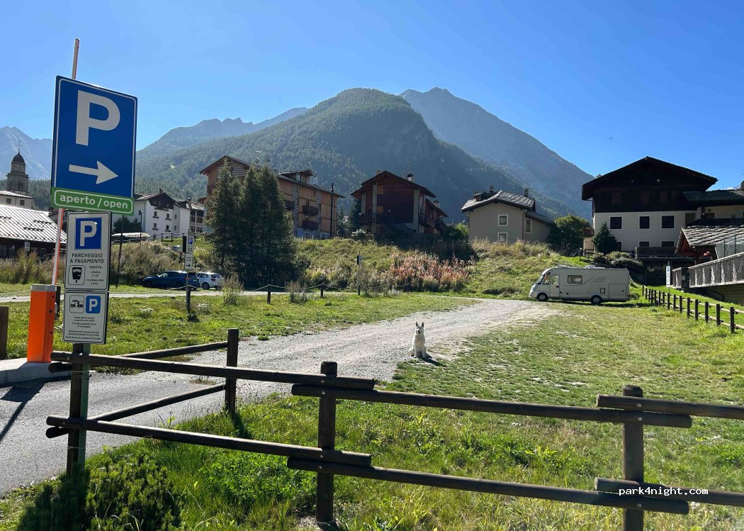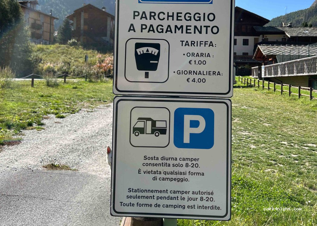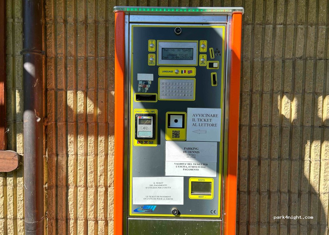 Parcheggio promiscuo con autovetture e segnalato come solo diurno (8/20). Su terra battuta misto erba leggermente in pendenza. Non illuminato. Accetta pagamento con carta elettroniche, banconote e monete.