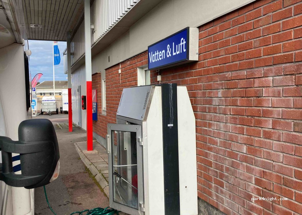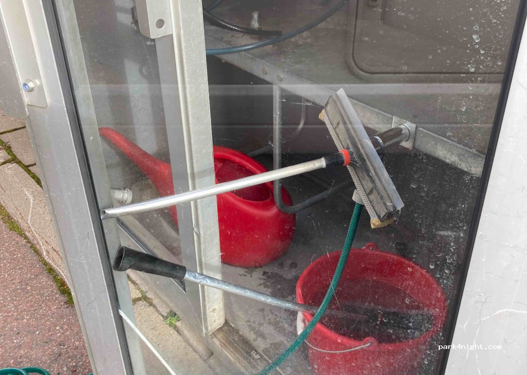 Water with Gardena connection at the Q8 gas station. Only with a pusher and little water pressure. But improvisation is enough to fill it.