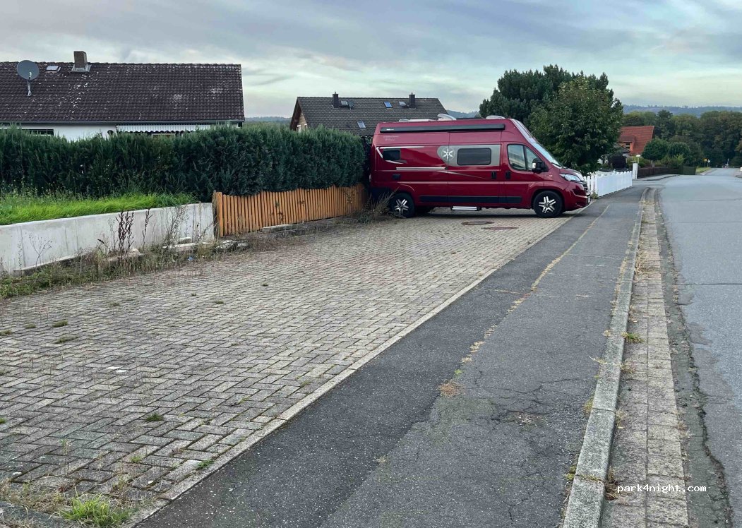 Die bisher am Ort bekannten Plätze sind nicht so optimal. So habe ich diesen Platz gefunden in einem Wohngebiet. Ebene Fläche, ausreichend für 5,99m, kein Verbotsschild.