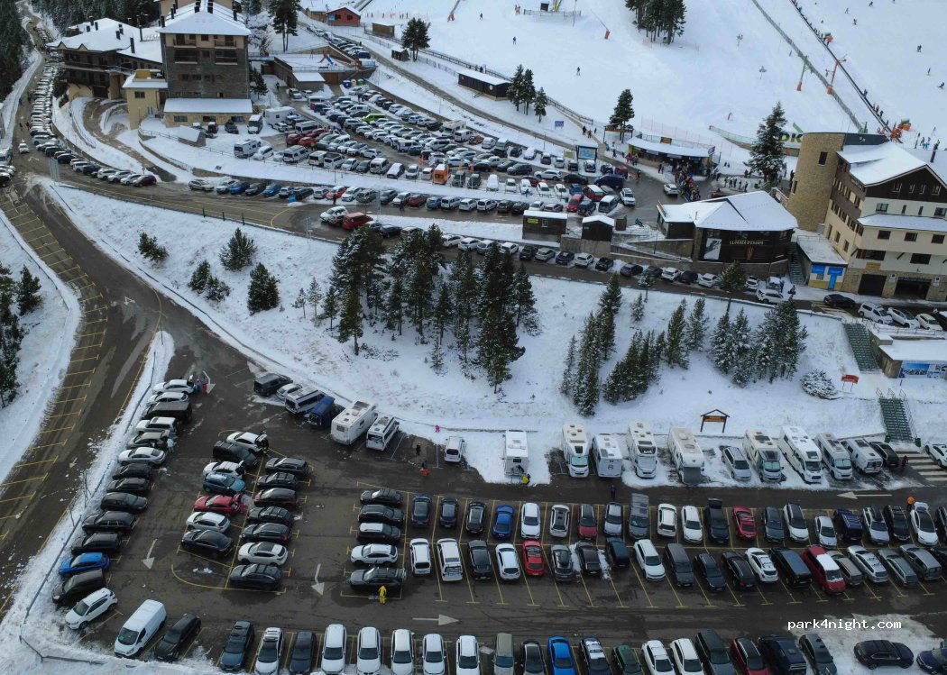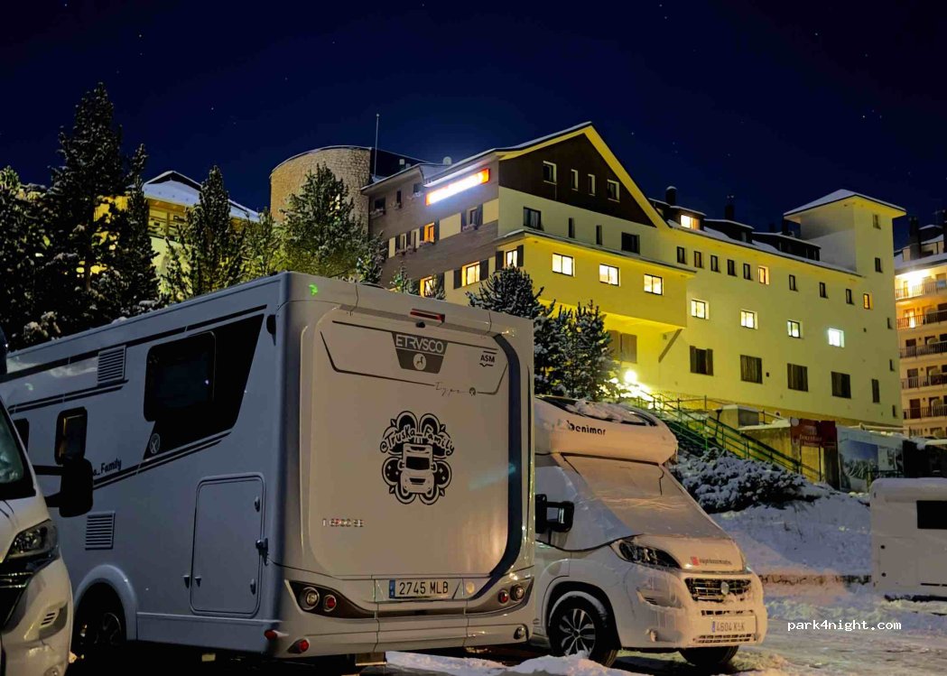 Pàrquing a peu de pistes molt ampli i còmode. A mitjans de desembre, ple d'autocaravanes. Només li falta zona de buidatge. Les màquines passen a les 07h a treure la neu, no pas abans. I el restaurant té obert fins tard a la nit,però no molesta gens ja que queda una mica apartat.