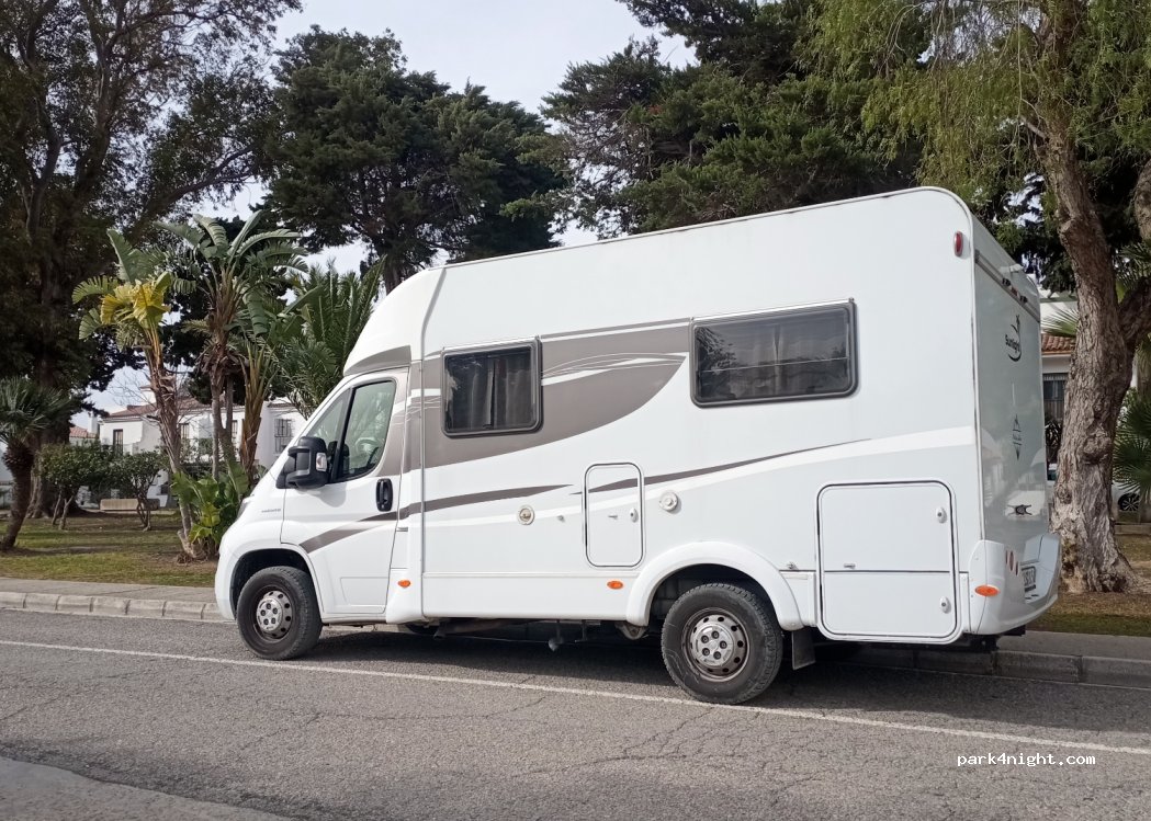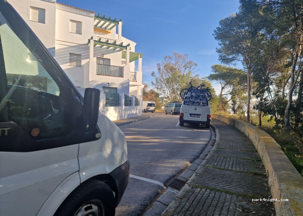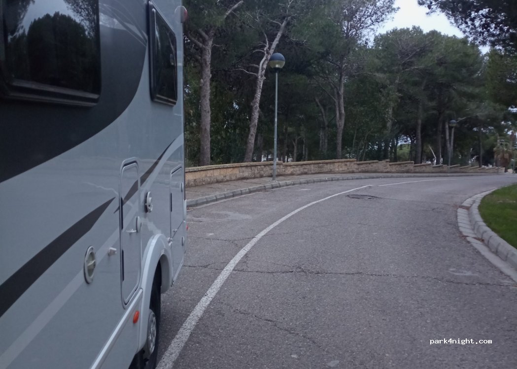 Aparcamiento en calle nivelada, ahí y un poco más abajo hay sitio para aparcar. Hay que ser discretos, a fin de cuentas es una calle con pisos al rededor. Pasamos una noche tranquila, pero mejor aparcar a las afueras.