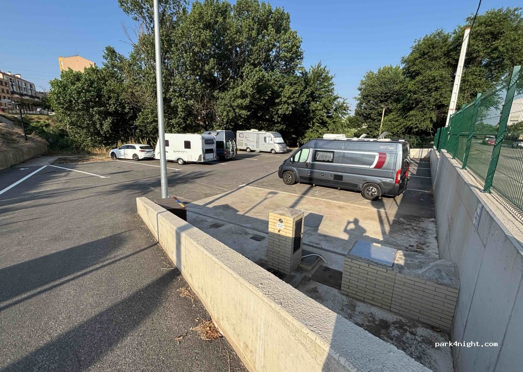 Great stop with all services. I recommend to park on the opposite side to the picnic benches as locals like to sit here until late, at least on a weekend. Quiet overnight otherwise. Rode our bikes from here to do a wine tasting at Bodegas y Viñedos Ilurce, it was very good. Family winery with a lot of history & quirky tails about some of there wine varieties. Definitely worth a stop