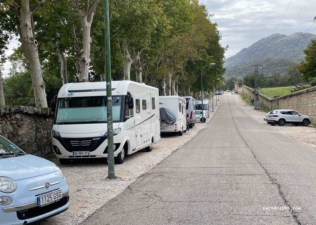 Endroit verdoyant et calme entre itinéraires de randonnée et parfait pour être avec un chien. La nuit, c'est très calme et pendant la journée, il y a des gens qui se promènent avec leurs chiens. Il y a suffisamment d'ombres pour six camping-cars ou plus.