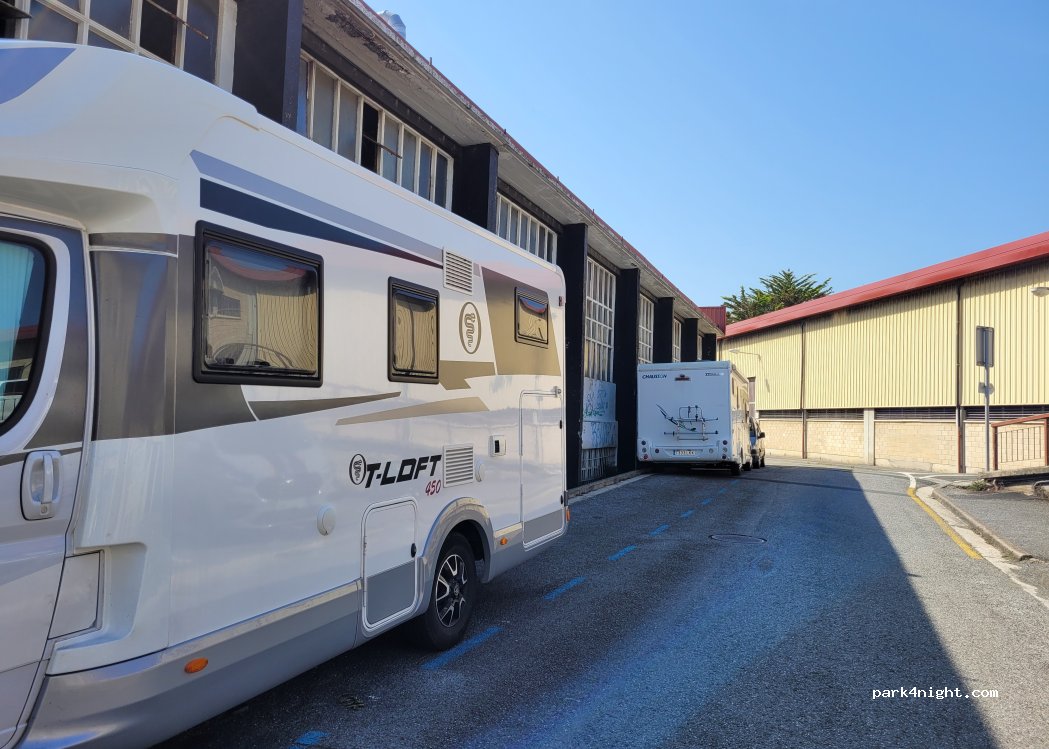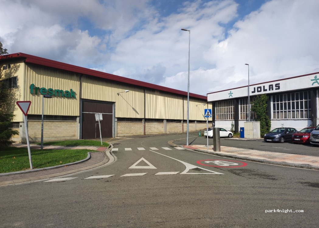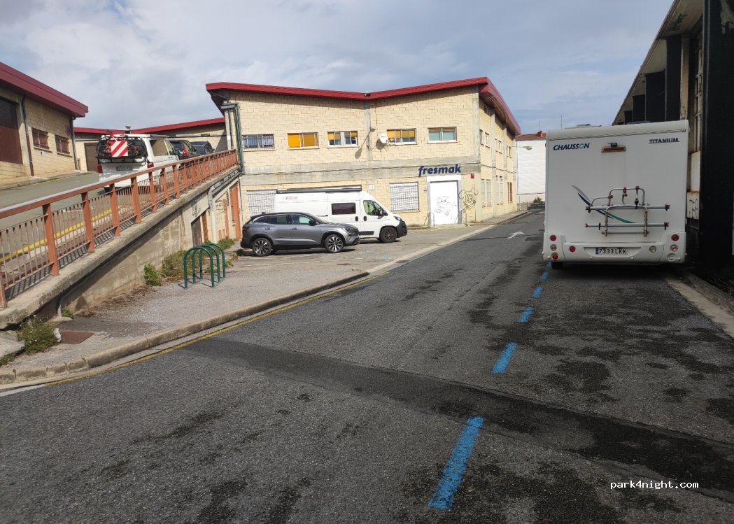 Quelques places mais assez grandes en entrant dans la zone commerciale et industrielle qui se trouve tout autour du supermarché Eroski. Il y en a d'autres en continuant dans cette zone, mais ici c'est très calme la nuit car on est loin des habitations (aucun risque de gêner les résidents) et il n'y a pas de passage. Gratuit de 20 h à 9h et tout le temps du 1 octobre au 31 mai.