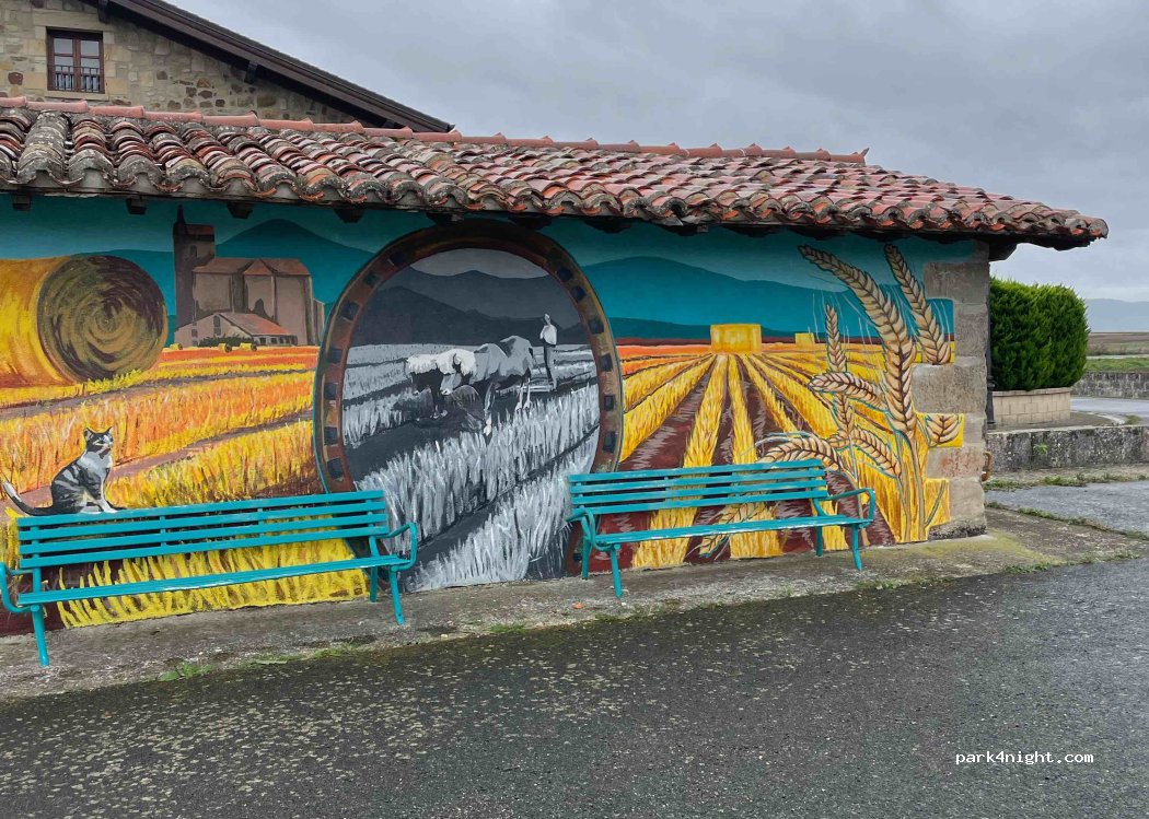 Es un pueblo muy pequeño. El sitio tiene bancos y está al lado de un antiguo lavandero, por lo que hay toma de agua. Se ve algún coche pero apenas vecinos. Zona tranquila para pasar la noche.