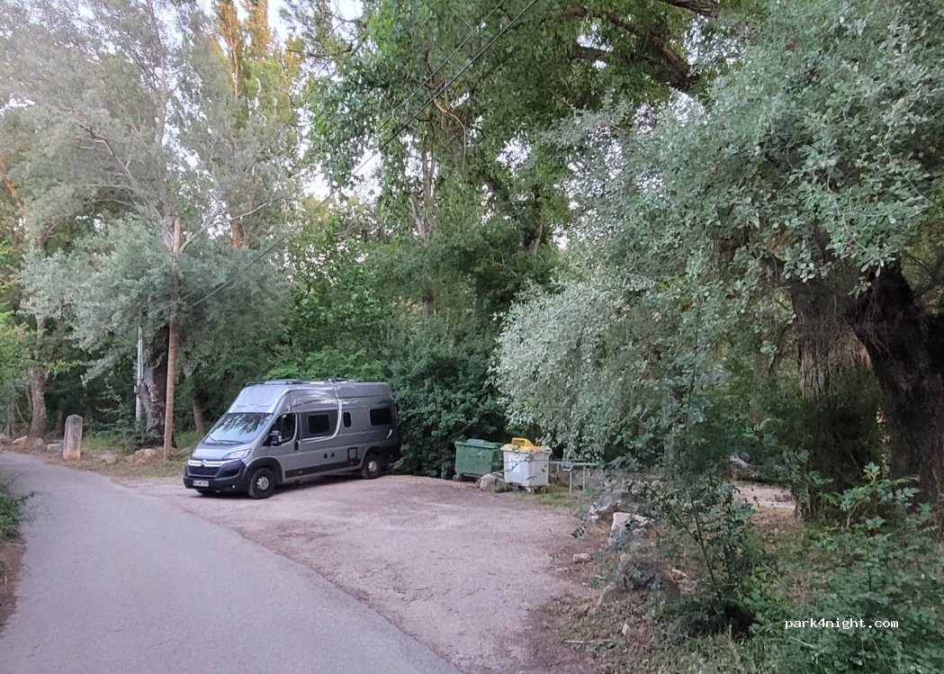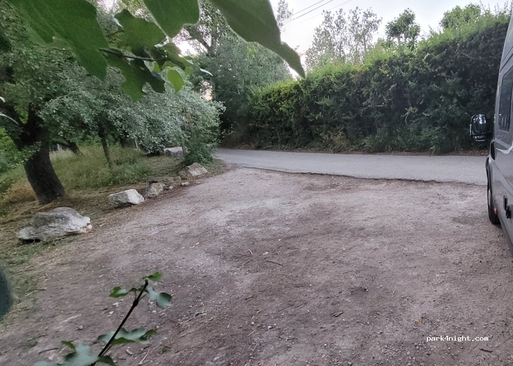 Ruhiger Platz an kleinen Bach ca. 19 Minuten mit dem Fahrrad von der Innenstadt entfernt. Max. 3 Stellplätze für Womos mit max 6,40 m Länge. Als wir gegen 17.30 kamen parkten 2 PKW dort. Ein Platz war frei. Ab 21.00 waren wir alleine.