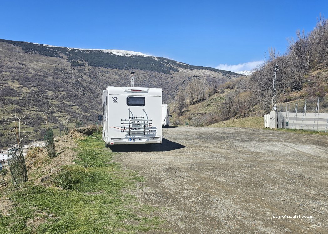Endroit très calme pour passer la nuit et proche pour visiter la charmante ville de Capileira. Il y a une piscine municipale (2€ l’entrée) à quelques minutes du parking. Il y a également une fontaine d’eau potable sur le parking.