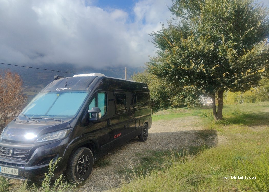 Amplio, aparcamiento, cerca del pueblo y amplia entrada para todo tipo de autocaravanas y tamaño. Vistas impresionantes.
