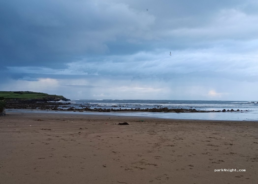 Parking de plage en dalle béton engazonnée, très stable et plat même en cas de pluie. Beaucoup de grandes places en bord de route peu fréquentée. Plage à 200 m. Accessible aux grands camping-cars. Pas d'interdiction pour les nuits.
