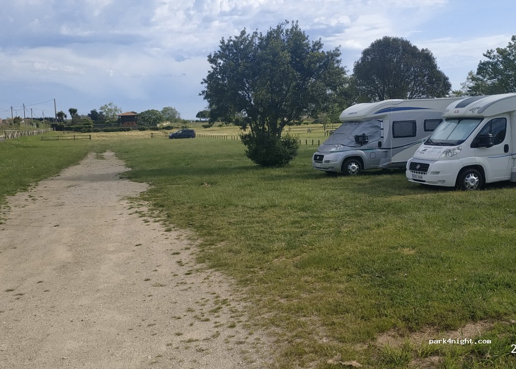 Beach parking in grassed concrete slab, very stable and flat even in the event of rain. Many large places along the side of the road, not very busy. Beach 200 m away. Accessible to large motorhomes.