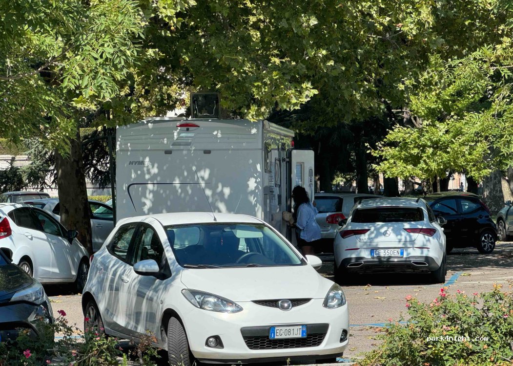Moltissimi posti e possibilità di parcheggio anche per mezzi di 6 metri e 36 cm di lunghezza (con il muso rivolto verso la strada). Si può pagare con EasyPark.Sicuro (passano spesso macchine dei vigili urbani e delle forze dell’ordine) e centralissimo; a due passi due dal Palazzo ducale e dal centro della città. Sul piazzale, un bagno a pagamento. Nessun servizio.
