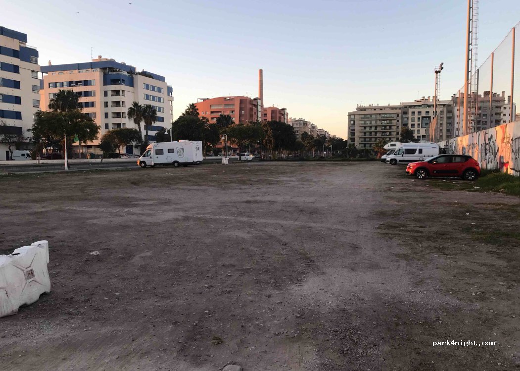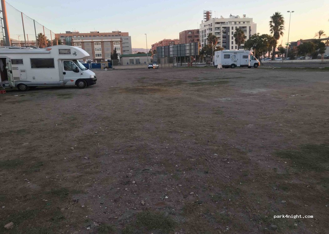 Grand parking sur terrain vague en terre situé le long des voix principales d’accès à Malaga par le bord de mer. Non loin du port. Proche de la plage et de quelques restaurants de bord de mer. Un parc jeux pour les enfants à 3min à pied. Derrière un stade. Quelques déchets, pas très propre mais idéal pour une nuit en ville pas trop loin du centre.