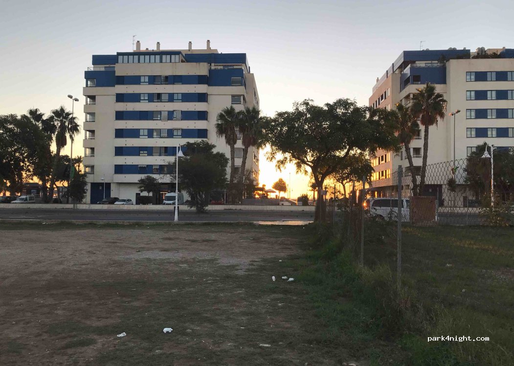 Amplio aparcamiento en terreno baldío situado en las principales vías de acceso a Málaga desde la costa, no muy lejos del puerto. Cerca de la playa y de algunos restaurantes junto al mar. Un parque de juegos para niños a 3 minutos a pie. Detrás de un estadio. Algo de basura, no muy limpio pero ideal para pasar una noche en la ciudad no muy lejos del centro.