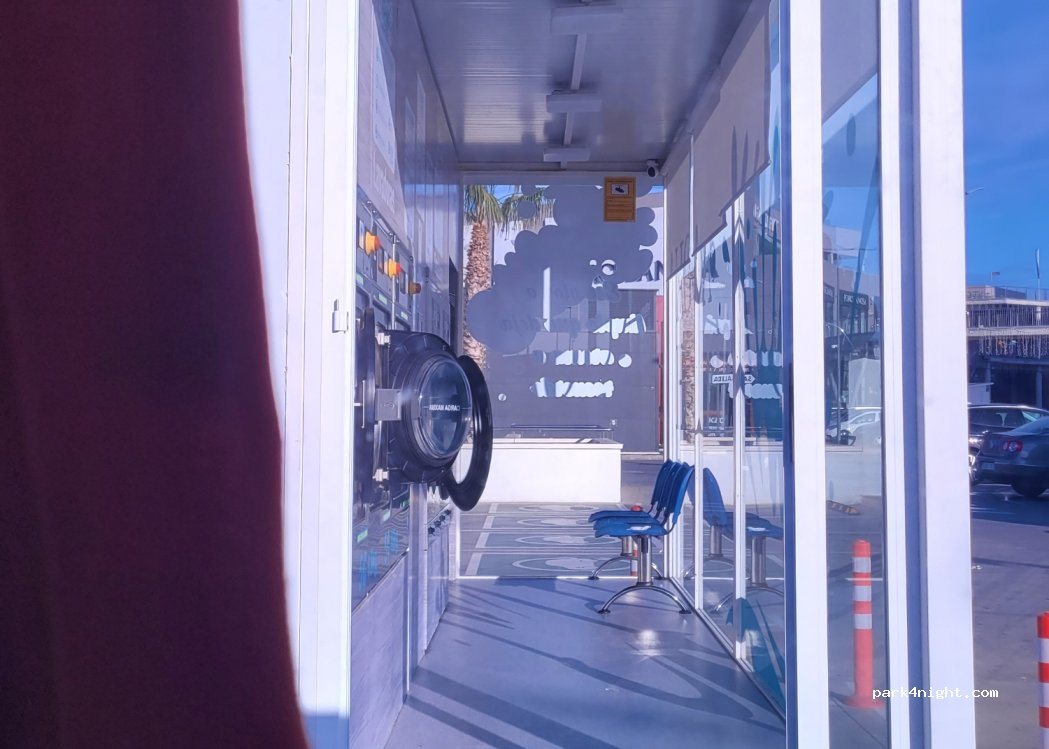 Lavandería en medio del aparcamiento del Centro Comercial. WiFi, pequeño parque infantil enfrente, muchas plazas de aparcamiento. Abierto de 08.00 a 22.00. Solo acepta tarjetas de pago, no efectivo.