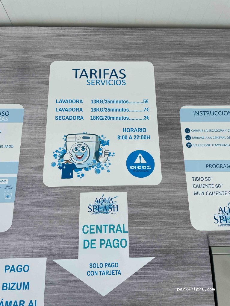 Laundromat in the middle of the parking lot of the Centro Comercial. WiFi, small playground opposite, lots of parking spaces. Open 08.00-22.00. Only accepts payment cards, no cash.