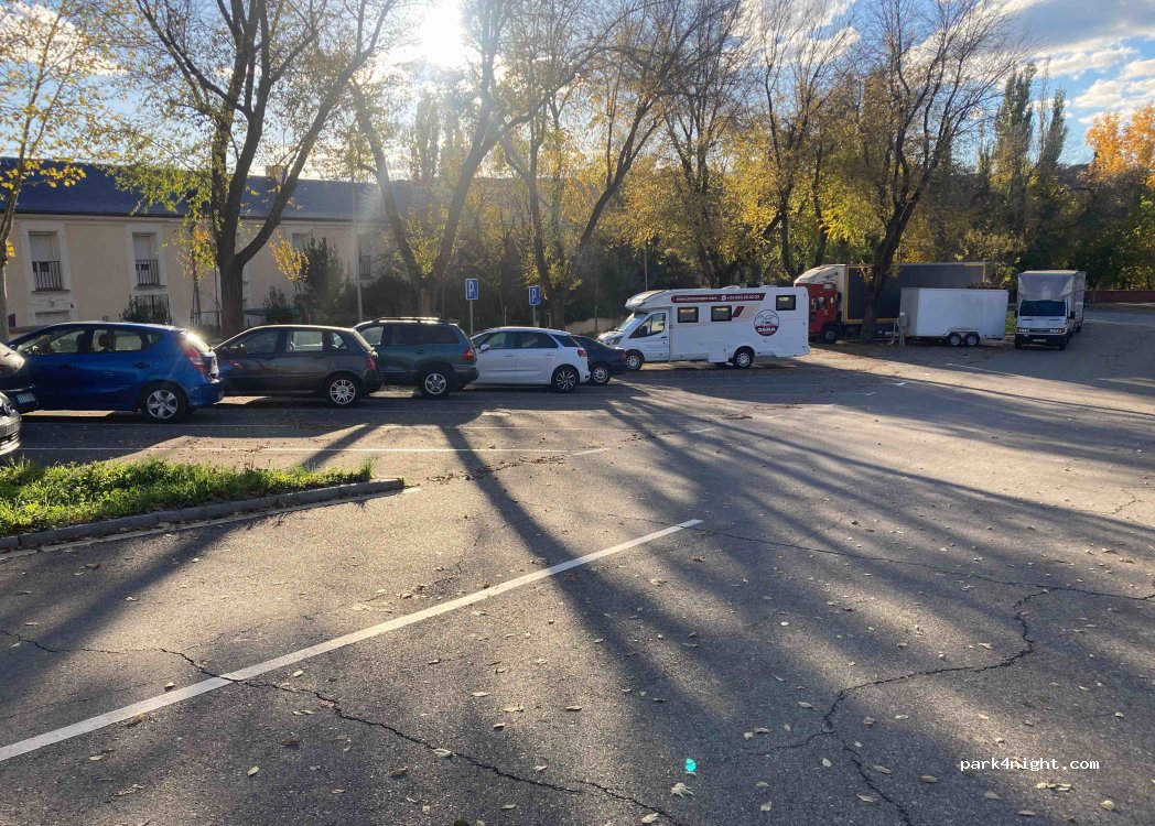 Parking ideal para dejar la autocaravana e ir a dar una vuelta por los alrededores, las plazas son muy largas y no hay problema de longitud, mucha seguridad por la zona ya que hay personal militar por la calle. Lo malo es que las plazas de la parte superior del parking tienen mucha inclinación lateral