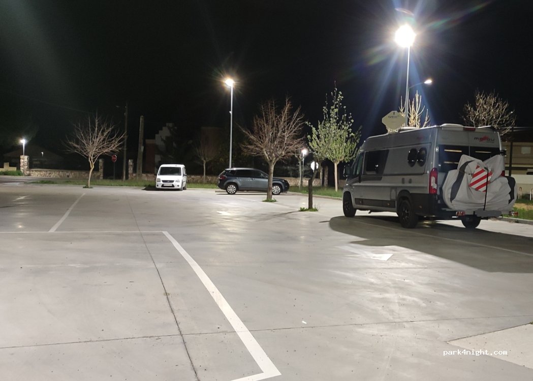 Explanada asfatada al lado de la piscina. En mayo hicimos noche solos, lugar tranquilo con mucha luz. Facil de llegar y aparcar.