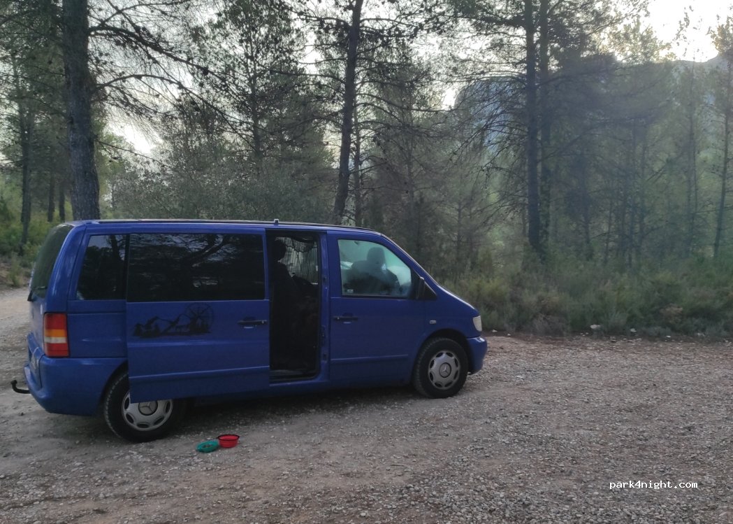 Aparcamiento de tierra en plena naturaleza, dentro de un pinar. Desde aquí sale una ruta al castillo de Chirel. Hemos pasado una noche muy tranquila y sin nadie a nuestro alrededor.