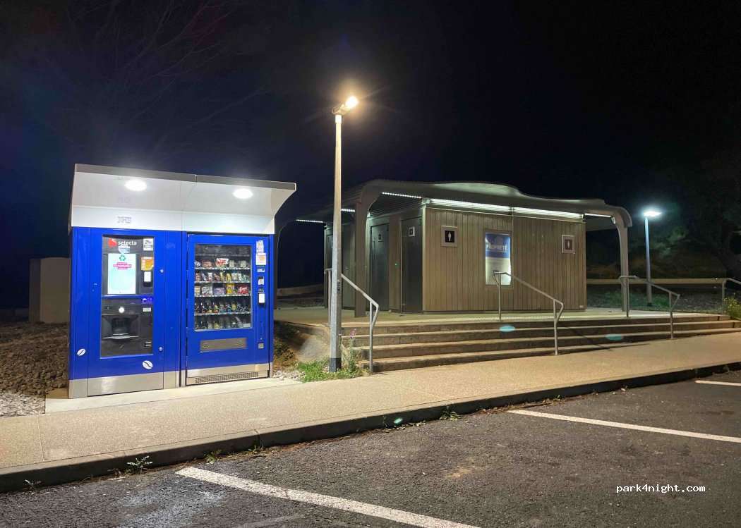 Rest area on the highway. It has a water tap in the back of the bathrooms. Free bathrooms, picnic table, vending machines, parking with truck area and car parking, not very large spaces ideal for a camper, or cars occupying 2 spaces. Ideal for spending the night or stop for lunch/dinner. Near Narbone.