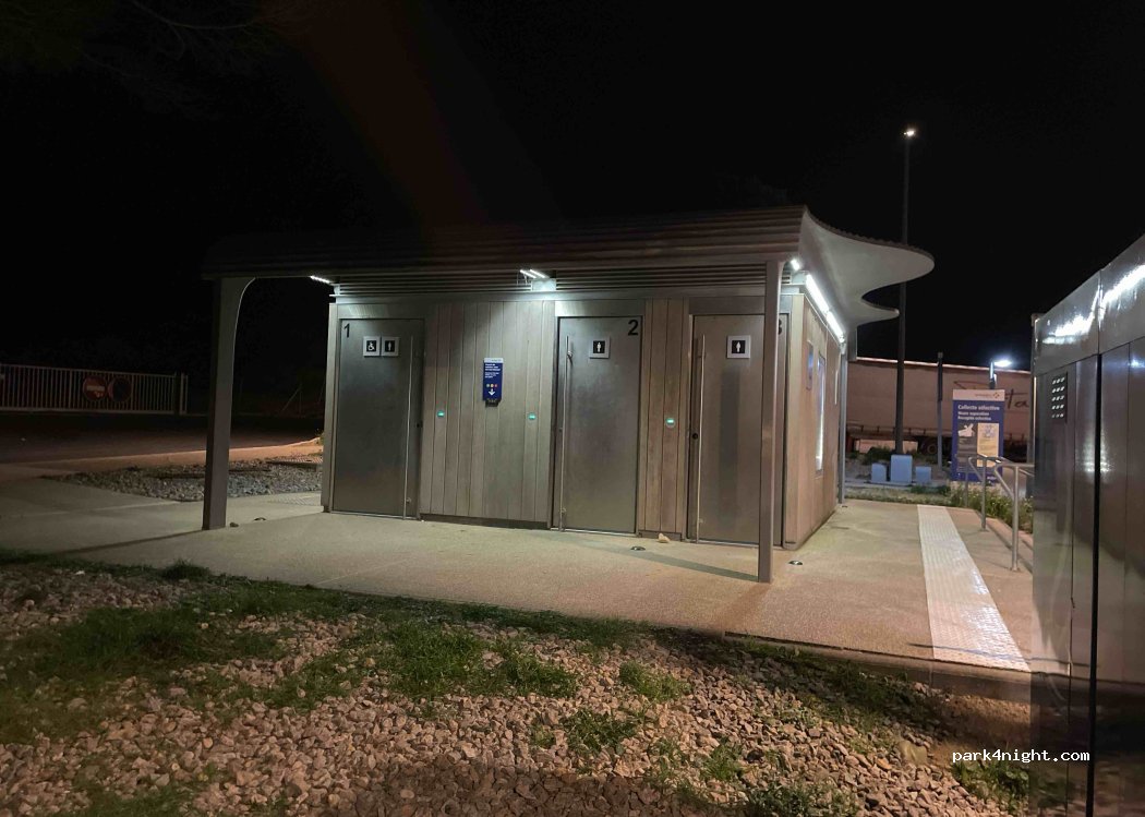 Aire de repos sur l'autoroute. Il y a un robinet d'eau à l'arrière des salles de bains. Sanitaires gratuits, table de pique-nique, distributeurs automatiques, parking avec espace camions et parking voiture, espaces pas très grands idéaux pour un camping-car, ou voitures occupant 2 places. Idéal pour passer la nuit ou s'arrêter déjeuner/dîner. Près de Narbonné.