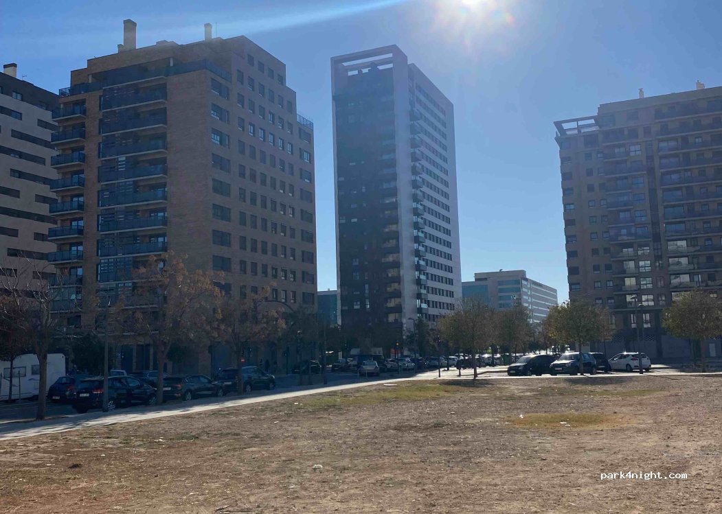 Great place to stay if you want to explore Valencia. By bicycle about 5 mins to city center, or Russafa which we found more fun. Were some more campers there as we parked. On the left side of the street ample parking space for our wide body Mercedes 814 Vario. During day quite busy but at night quite calm. So no fear of break ins during the day or wake ups at night.
