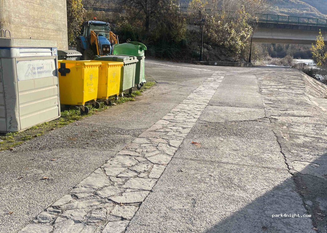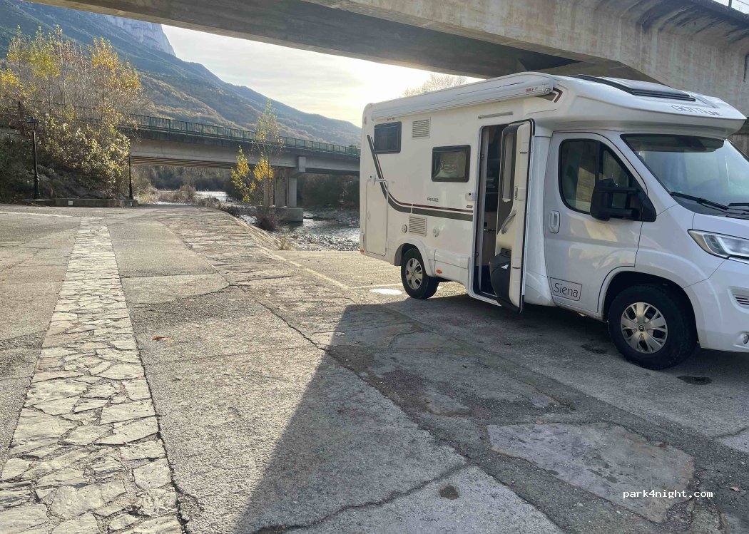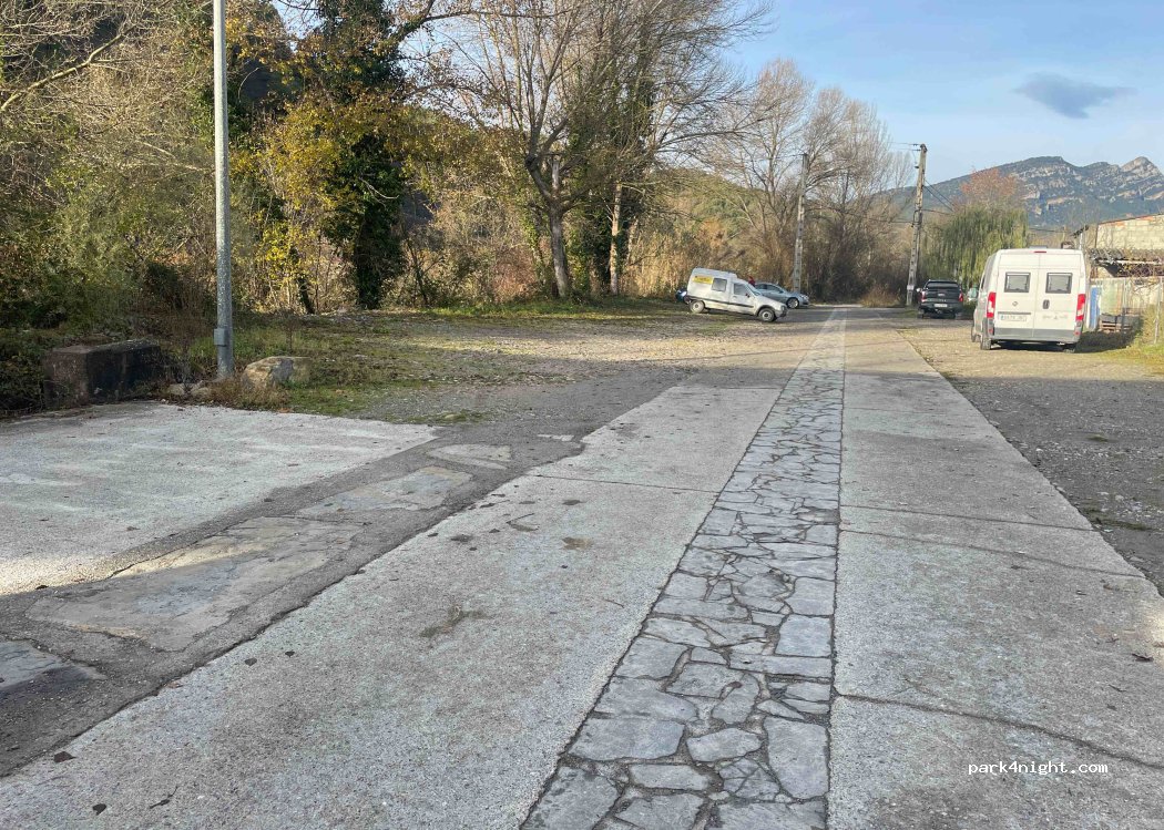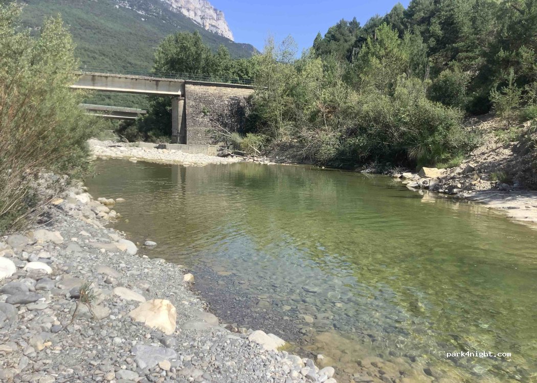 Lugar tranquilo y gratuito donde pasar la noche junto al rio, después de ver ainsa. Sin servicios, únicamente basuras. Si sigues por el camino vas a dar a distintos descampados con mayor tranquilidad!
