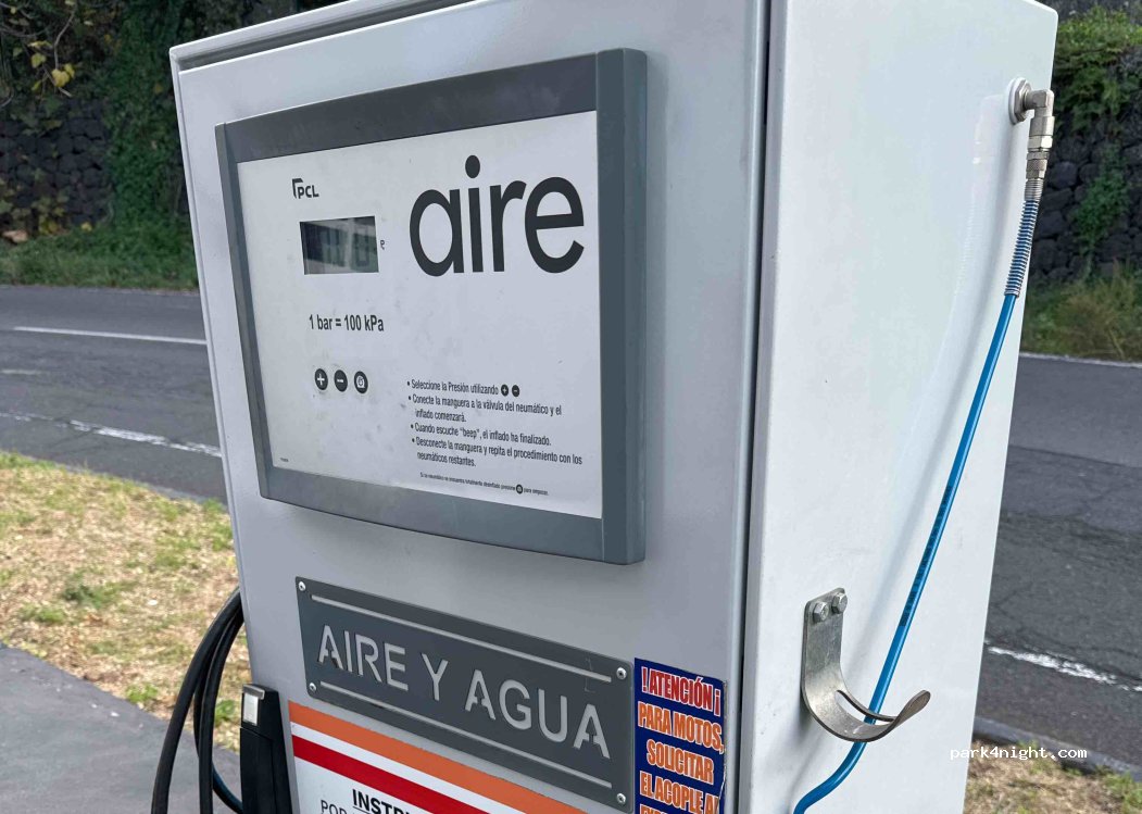 A fuel station, with vacuum cleaner, water, air for tires and restaurants