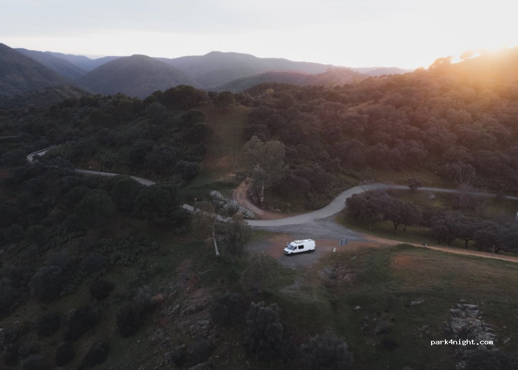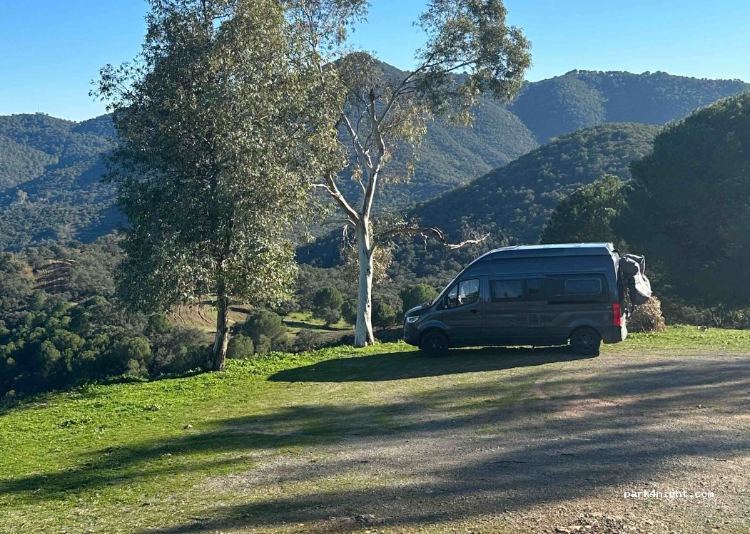 Spot sauvage, terrain non plat,route de montagne déconseillée aux CC (zone de chasse ou nous avons croises bcp de gros 4x4 avec remorques obligeant à se serrer) réseau internet aléatoire..pas de possibilité de se garer près de la Maison Blanche qui est la maison de chasse du coin et privée , nuit hyper calme avec zéro passage de voiture …plusieurs spots sur la route en descendant vers Santa Maria