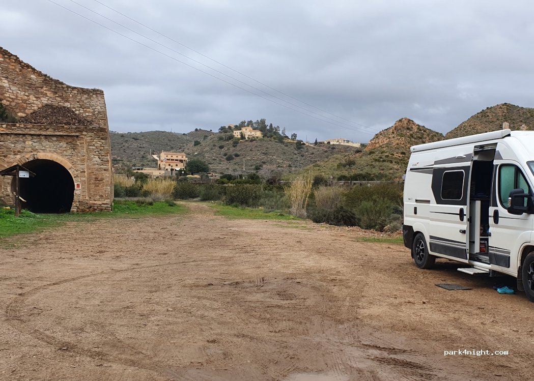 Aparcamiento al inicio de la Ruta de la mineria de Bedar. No está prohibido pasar la noche aquí. El camino puede resultar un poco molesto. La ruta de senderismo es muy bonita con vistas a Bedar.
