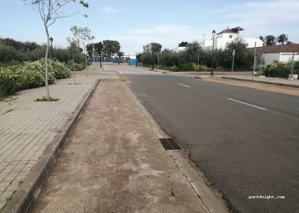 Large parking areas, quite flat, next to the pavilion and municipal indoor pool. Close to the center of town, a playground, a restaurant area and bus stops that take you to Seville in 20-30 minutes. You can spend the night since at the moment there are no municipal ordinances that prevent it.