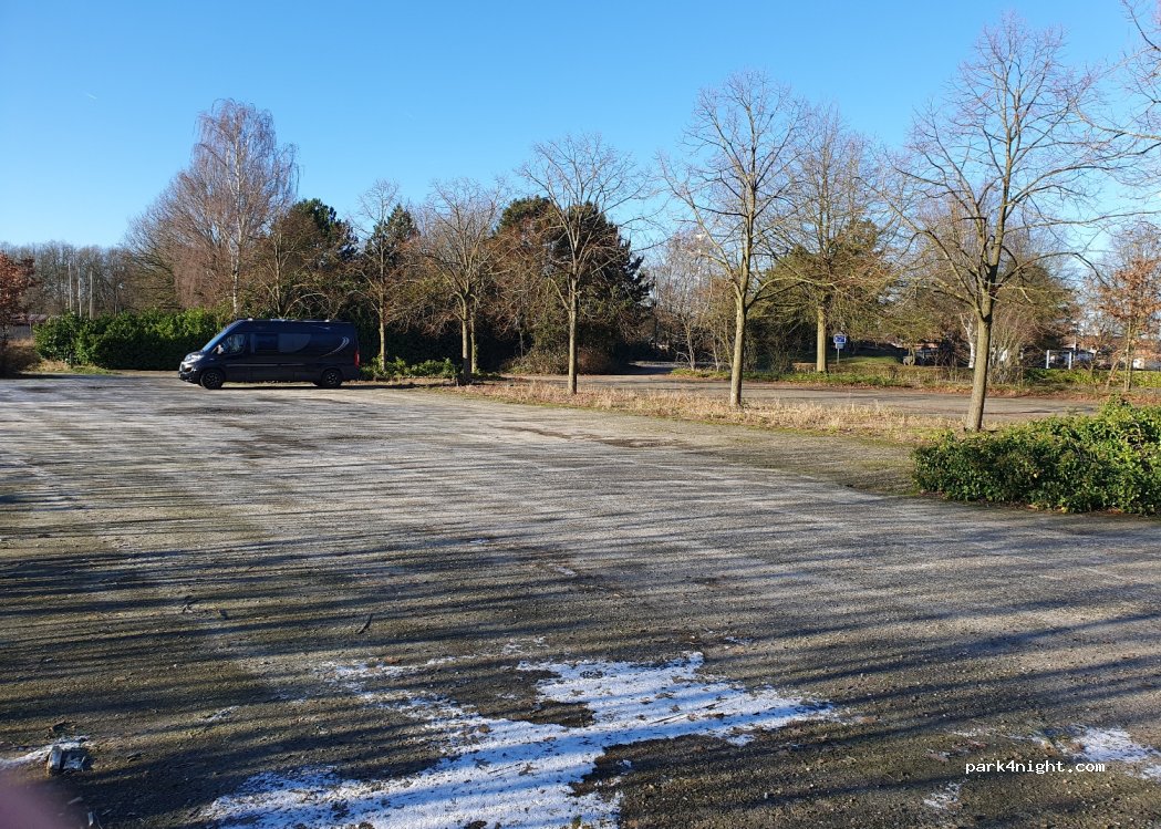 Verharde parking voetbalplein Olen, veel grote plaatsen en in de zomer schaduw onder bomen. Naast een wijk en heel rustig overnachten.