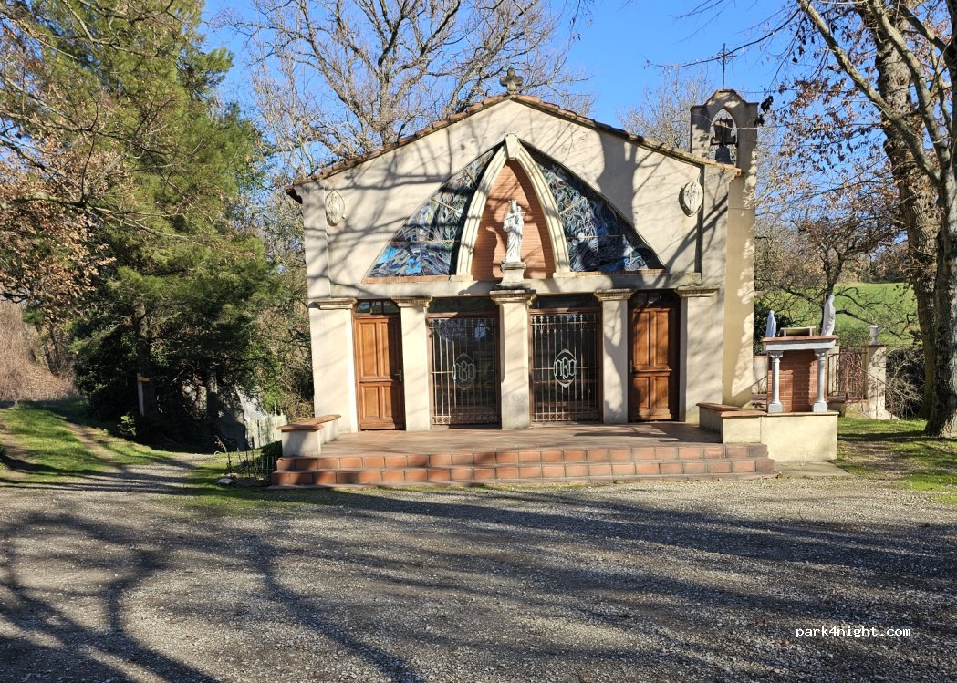 Petit parking pour un véhicule à utiliser hors jour de culte. Petite chapelle et grotte. Le long du sentier pour aller a Saint Papoul. Il y a un robinet d'eau à utiliser contre une offrande dans la boite à offrande.