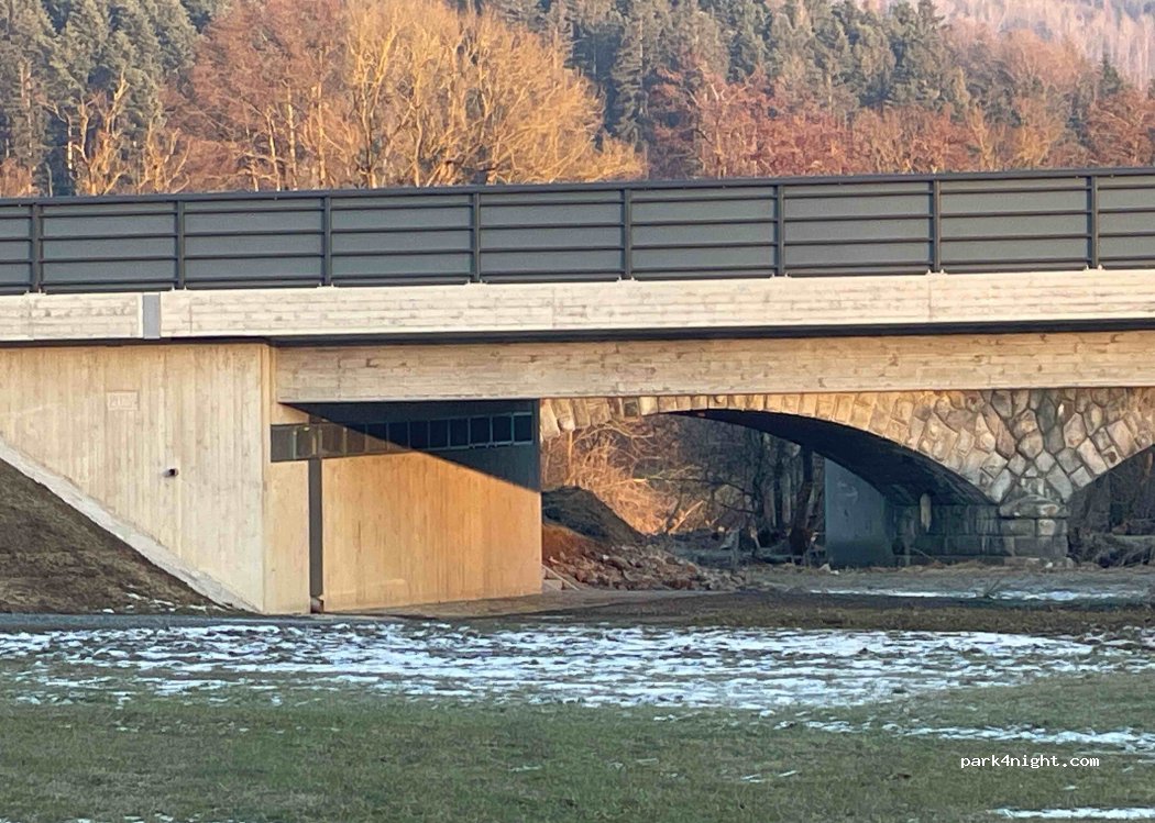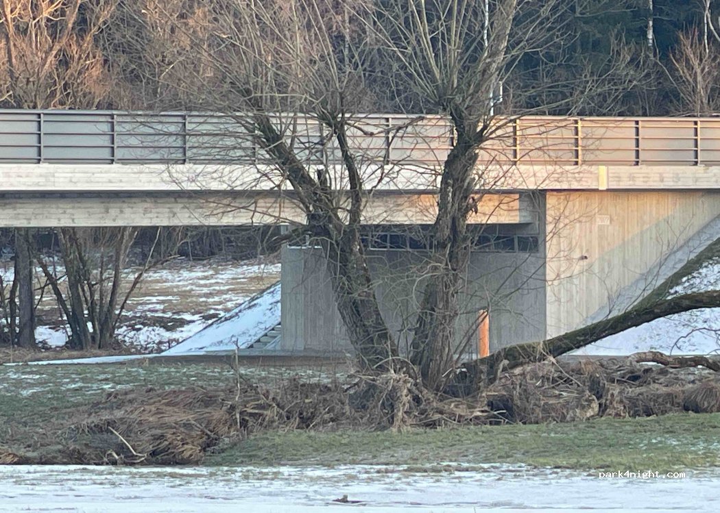 Directly under the B 85 bridge. No parking signs, but no prohibition signs either. Higher on one side than on the other side.