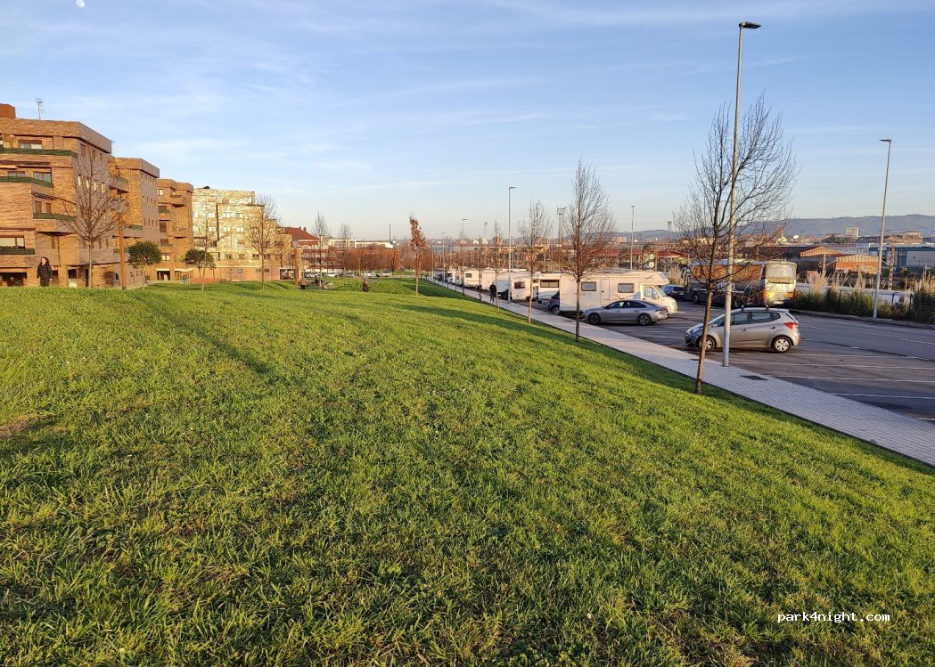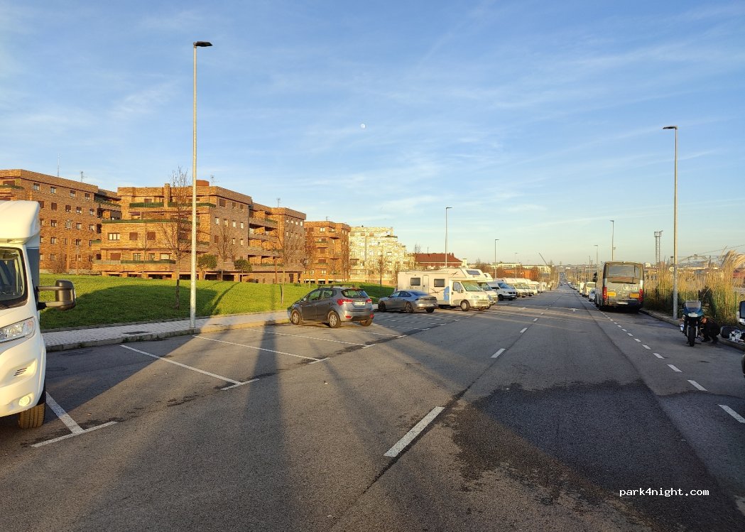 Es un aparcamiento asfaltado en una calle sin salida, se comparte con autobuses, camionetas, turismos, etc. Tranquilo (salvo por el tren) y seguro. Sin servicios (solo contenedores).