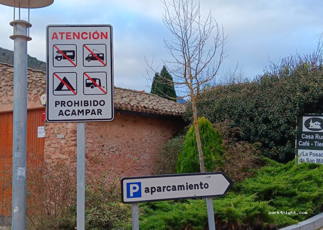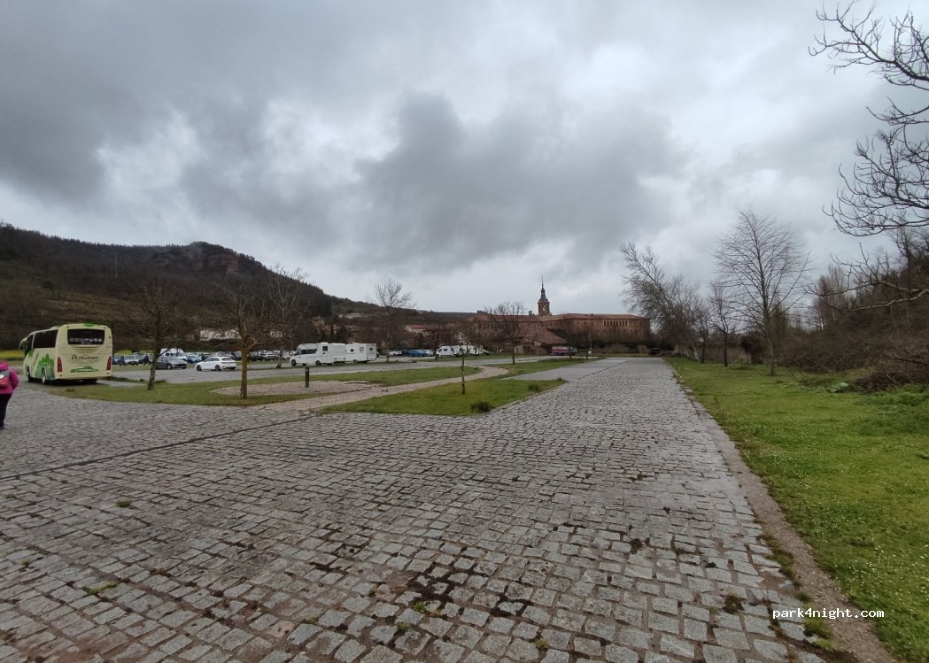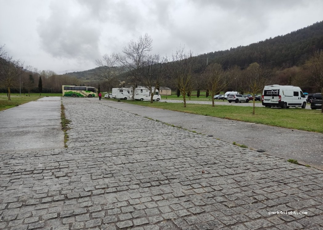 Enorme parking. Hoy es Viernes Santo y la mitad está vacío ( está lloviendo). Indica prohibido la acampada, no dice nada de pernoctar. Se podría preguntar a quien le interesase en recepción. Nosotros solo lo vamos a utilizar para visitar los Monasterios. Suelo es de asfalto y adoquines. Hay algún árbol para cuando se necesite sombras.