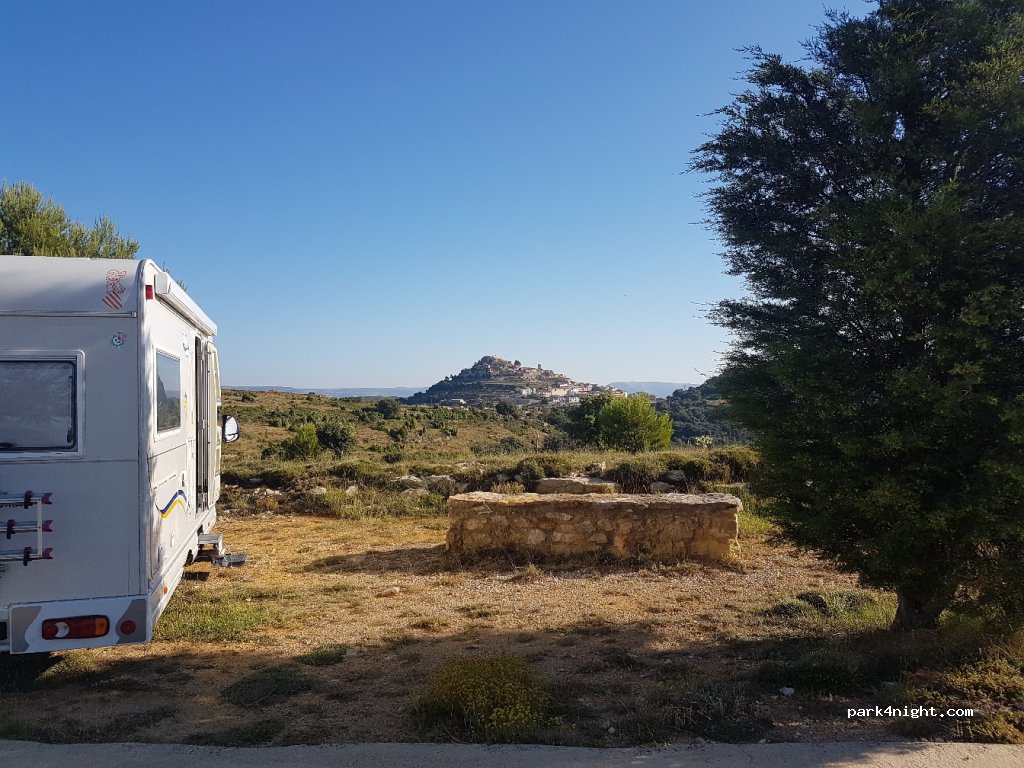 L'aire de stationnement de l'Ermita de San Cristobal en Culla Sans aucun service. Belle vue sur le village de Culla. On nous a proposé ce site pour passer la nuit au bureau d'information de Culla.