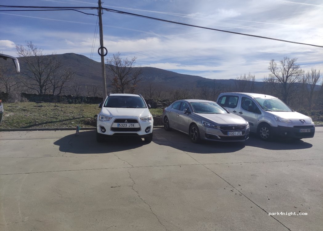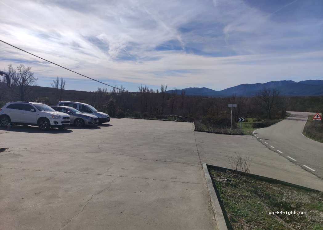 Parking pour véhicules avec espace pour camping-cars, quelque peu incliné mais avec de très belles vues. Sans services et gratuit. A côté d'une route mais avec très peu de circulation, très calme pour dormir