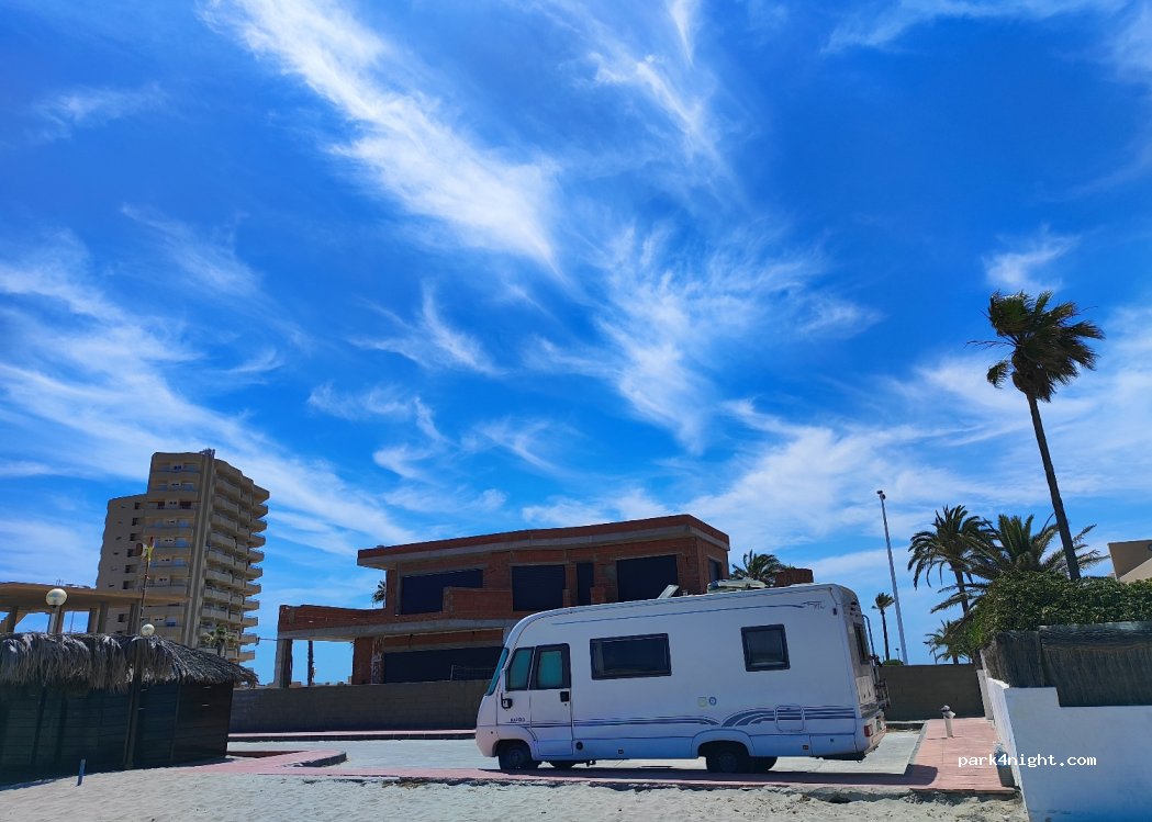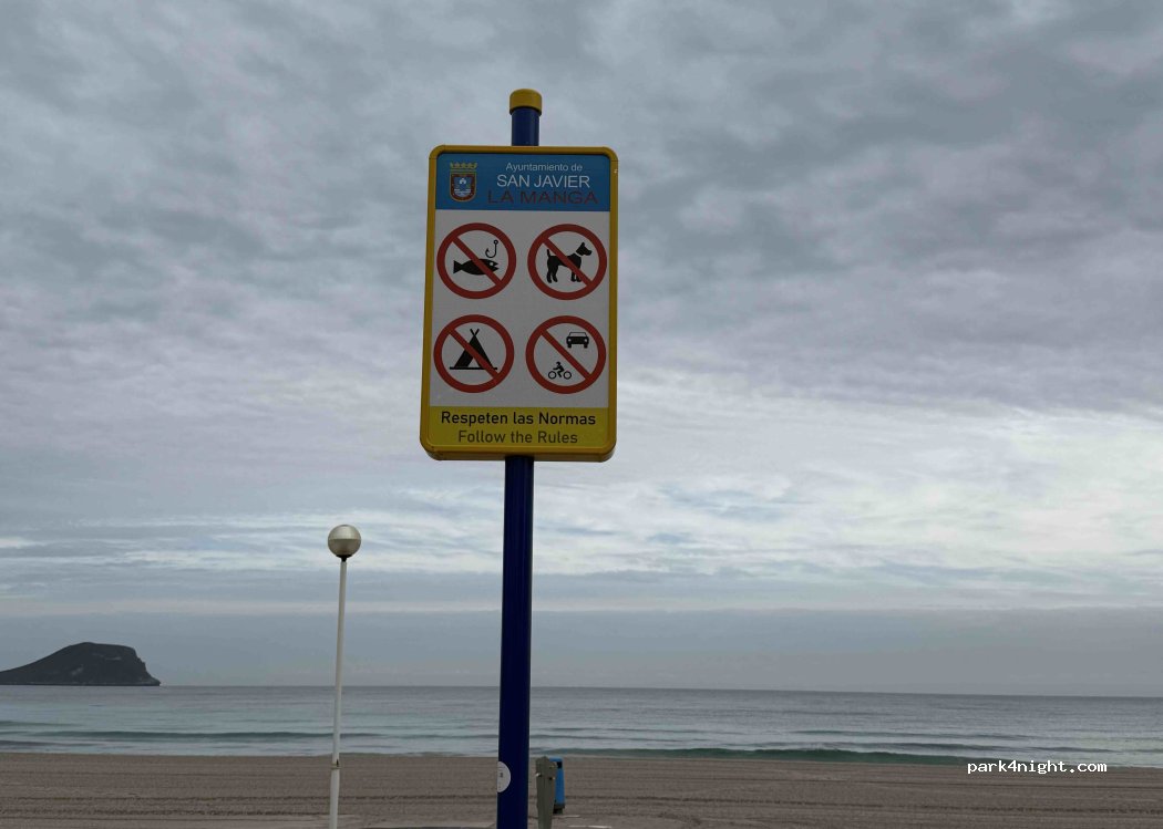 Frequentierter pkw parkplatz direkt neben einer strandbar die bis 01:00 nachts geöffnet hat. Keine wendemöglichkeit für wohnmobile länger als 6 meter. Polizei auf la manga kontrolliert streng und verteilt strafzettel. beachten sie das neue nationale wohnmobil gesetz in spanien: dgt prot 2023/14 camping verhalten verboten (markise, stuhl, tisch, trittstufe, schuhe, hundedecke etc.)