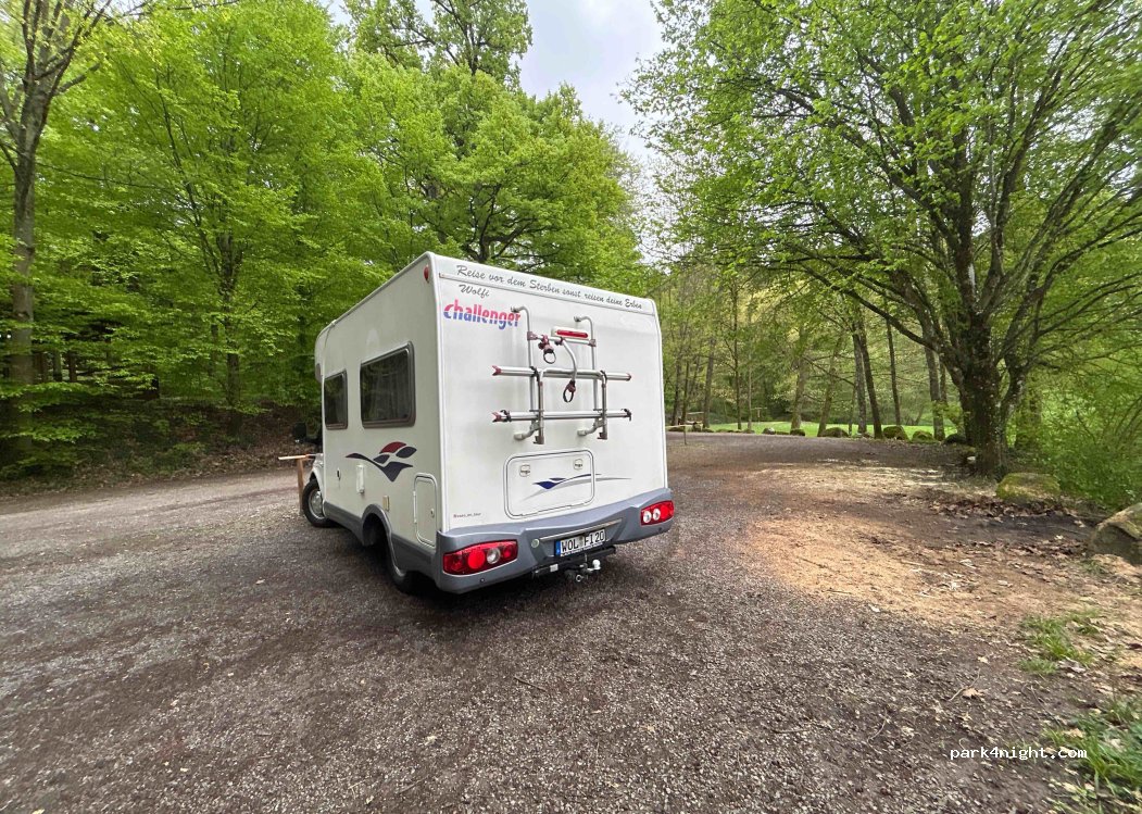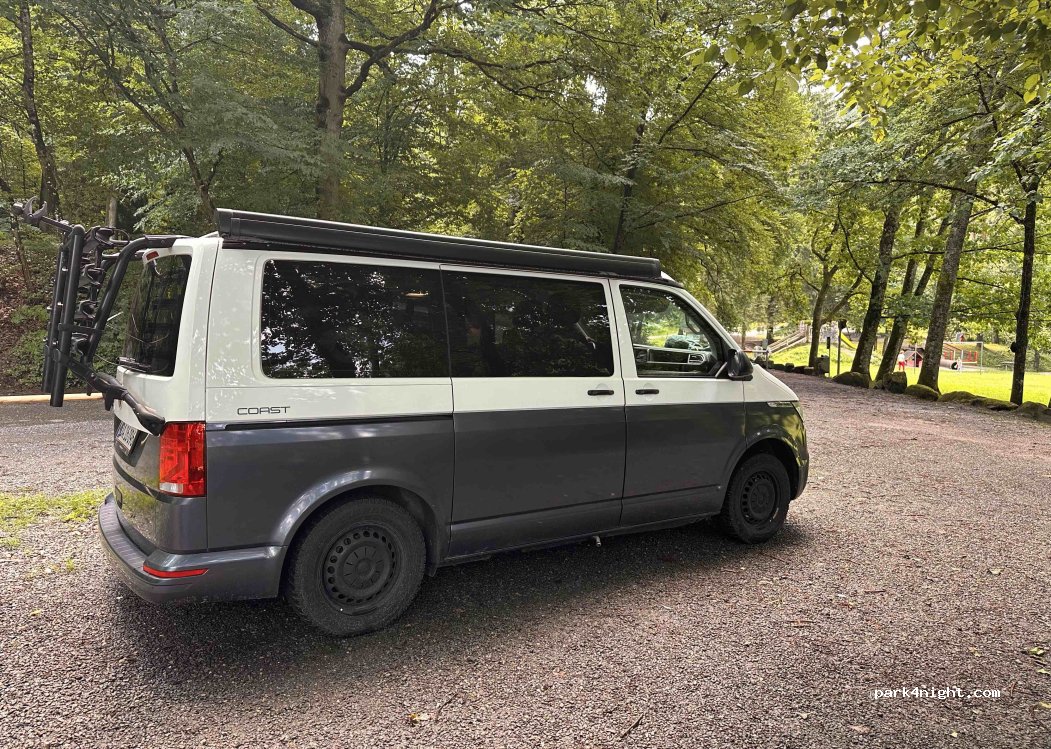 An einem Waldspielplatz Für eine Übernachtung sehr ruhig und schön, tagsüber wahrscheinlich einige Familien. Grillplatz und Dixi Klo vorhanden