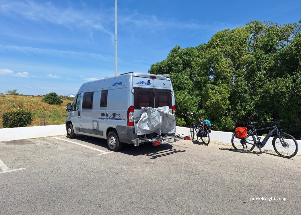 There is space for 4 motorhomes. The lots are even suitable for longer ones. Of course this is no romantic spot. Yet, as had to experience that the Portuguese police is enforcing a zero tolerance strategy on anybody staying outside a campground with a motorhome or any vehicle that has some sleeping possibility inside (=120-600 fine) one has to be very grateful for this spot.