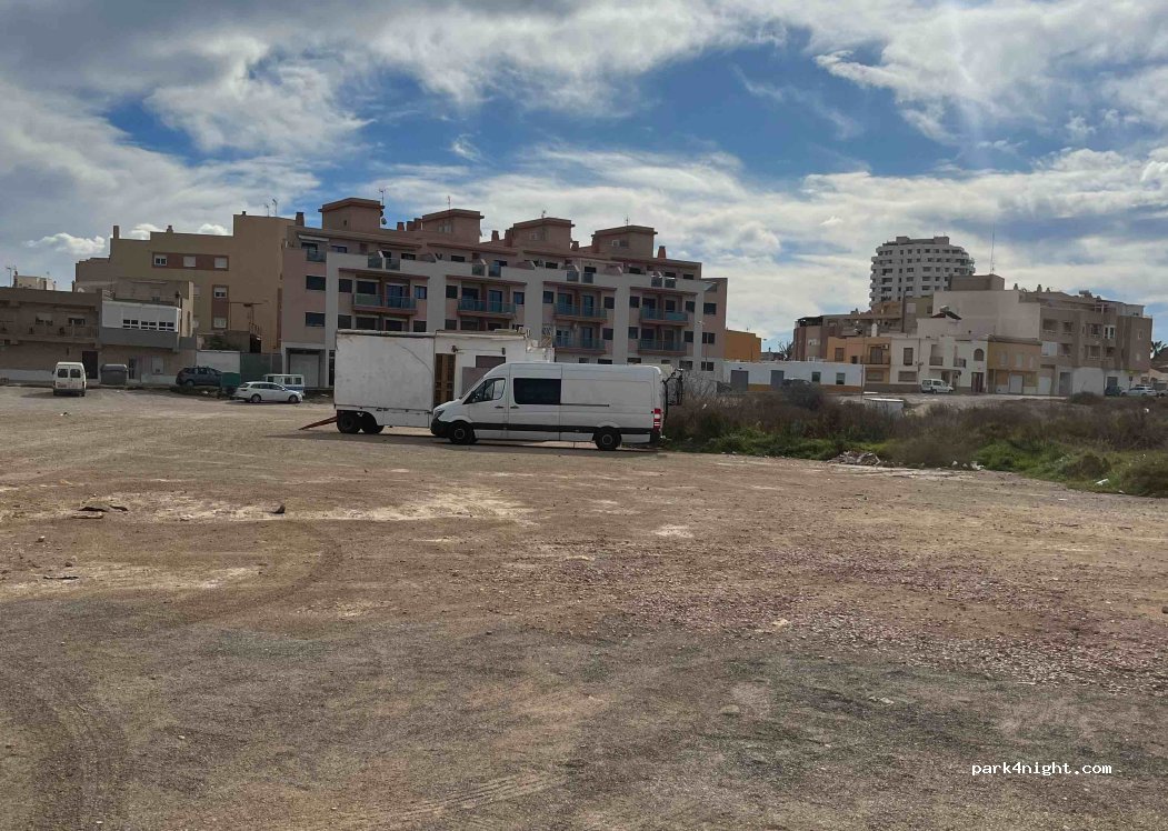 El descampado está cerca de una calle con mucho tráfico, viernes noche hay una sala de fiestas, hemos tenido que marcharnos a las 00,30h a otro sitio a descansar.