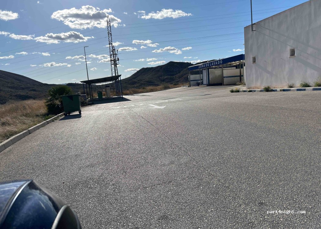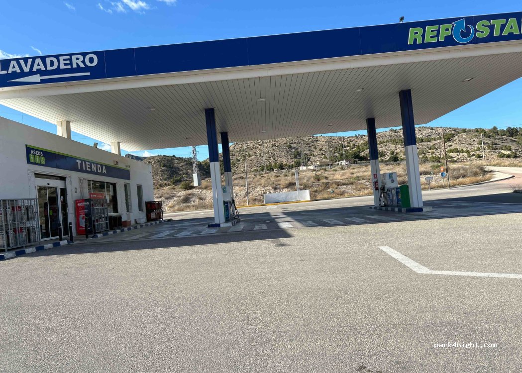 Gasolinera con precios baratos de gasoil y gasolina. Agua potable posible en una fuente, grifo sin rosca