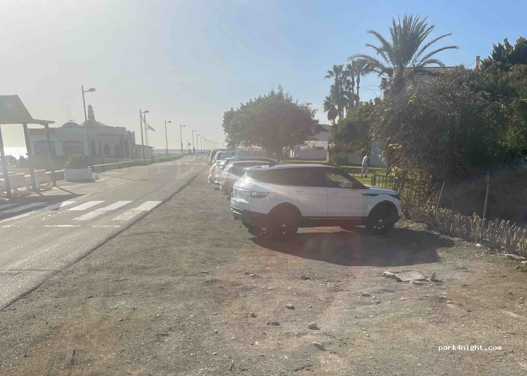 Great park up for larger motorhomes plenty of space to reverse in. We are 8 meters with bike rack. Better than the carpark along the road as its too small for the many motorhomes parked there. Its a lovely quiet sea view and short walk into Calahonda. Water was turned on at the water fountains for containers if needed.