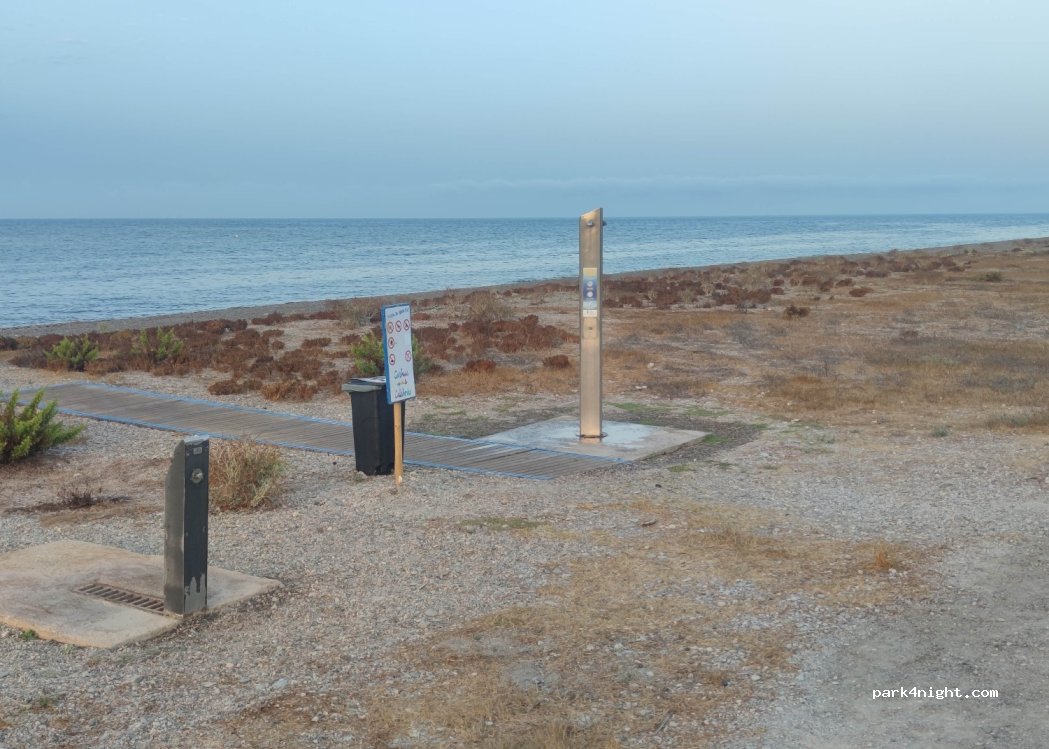 Un aparcamiento en primera línea de playa, una playa limpia y muy bonita. La carretera que cruza es tranquila y poco transitada. Hay baños públicos y duchas en la playa. Por las noches se está tranquilo.