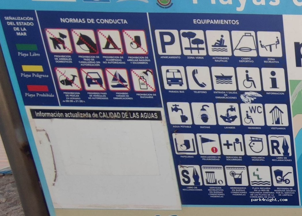 abbiamo passato una notte molto tranquilla, di fronte al mare. C'erano altri camper. A 30 metri c'è un Chiringuito con un buon menu di pesce. Non c'è passaggio frequente di auto, quasi assente (in questo periodo dell'anno perlomeno). Posto sicuro. Bagni pubblici fuori servizio. Vicino è presente un bidone per la spazzatura.