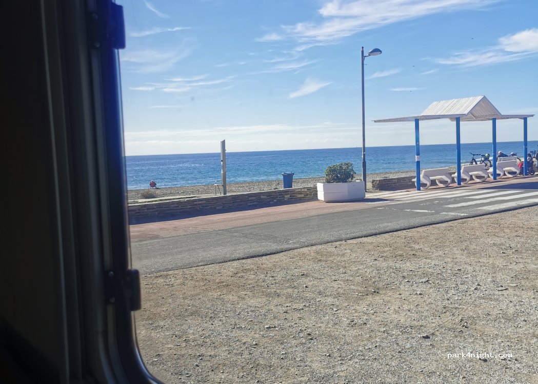 Free parking by the beach. Space for a big motorhome. 6-7 parkings spots. Not many cars drive past at night, so its not so much noise. Trash cans near by and public toilet available.